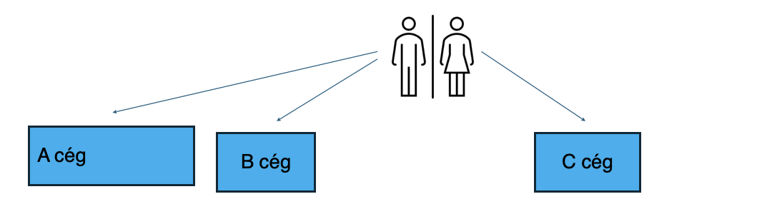 Vagyis, a fő szabály alapján az alábbi ábra szerinti A és B cég forgalmi, vagyoni és dolgozói adatai nem adandók össze a kkv méret meghatározásakor, akármekkora részesedése van is a magánszemélynek az egyes cégekben: